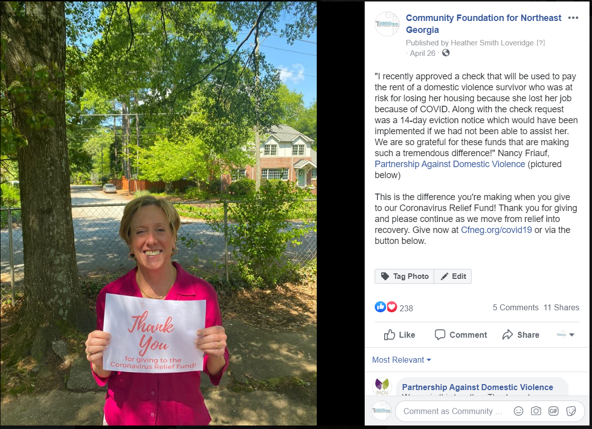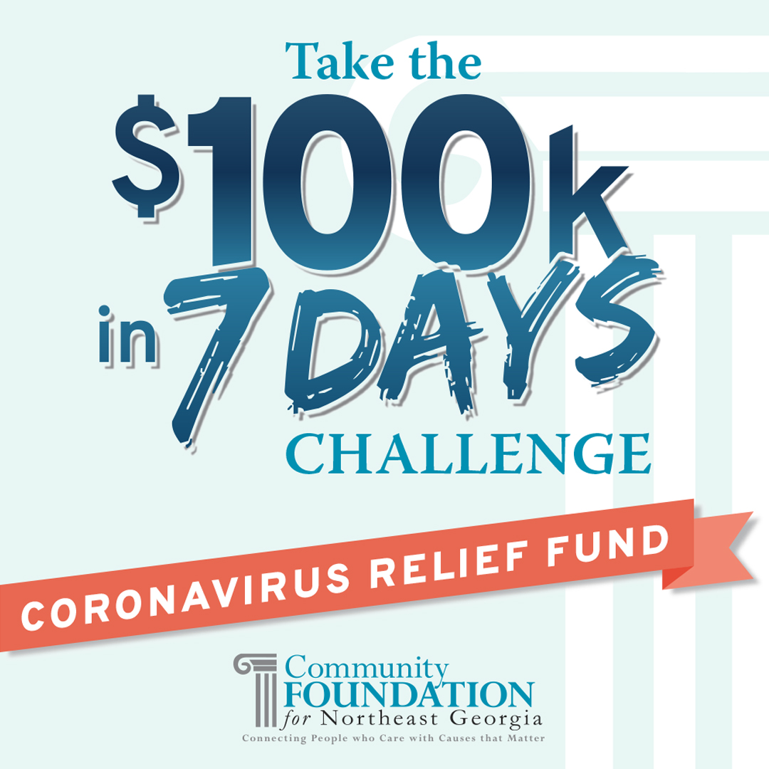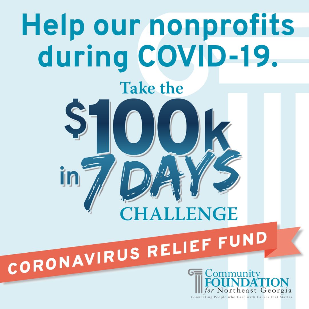 The Community Foundation for Northeast Georgia created a Coronavirus Relief Fund in March 2020, with the goal of helping raise funds that would be granted out quickly and strategically to local nonprofits. We created messaging and graphics around the fund and the dollars began coming in. In April, CEO and President Randy Redner wanted to see if the Community Foundation could raise a large amount online. He set a big goal of raising $100,000 and we began planning the campaign. We created the theme of “$100k in 7 Days” and designed graphics and copy to go with it. Our strategy included eblasts, social media, website updates and social ads.